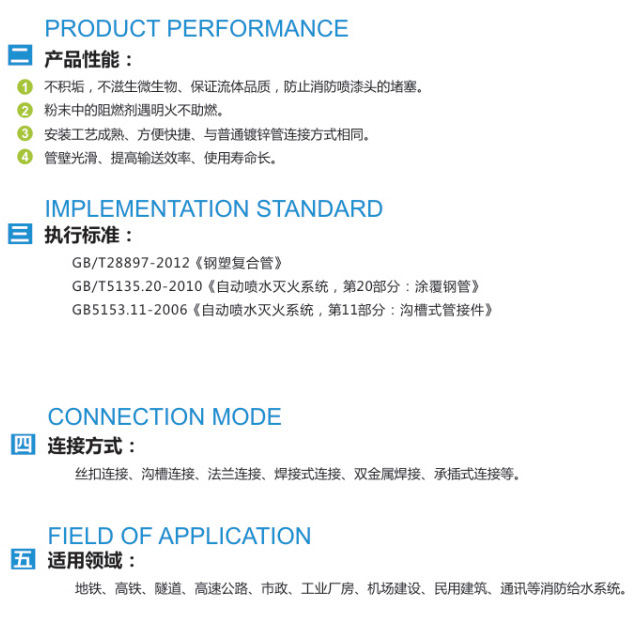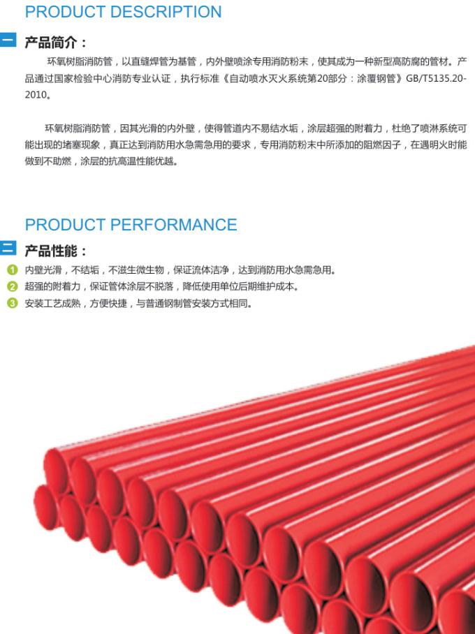 環氧樹脂消防管,以直縫焊管為基管,內外壁噴涂專用消防粉末,使其成為一種新型高防腐的管材。產 品通過國家檢驗中心消防專業認證,執行標準