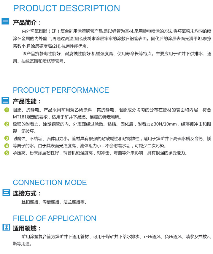 簡(jiǎn)介:內(nèi)外環(huán)氧樹脂(EP)復(fù)合礦用涂塑鋼管產(chǎn)品,是以鋼管為基材,采用靜電噴涂的方法,將環(huán)氧粉末均勻的噴涂在金屬的內(nèi)外壁上,再通過高溫固化,使粉末涂層牢牢的涂敷在鋼管表面。